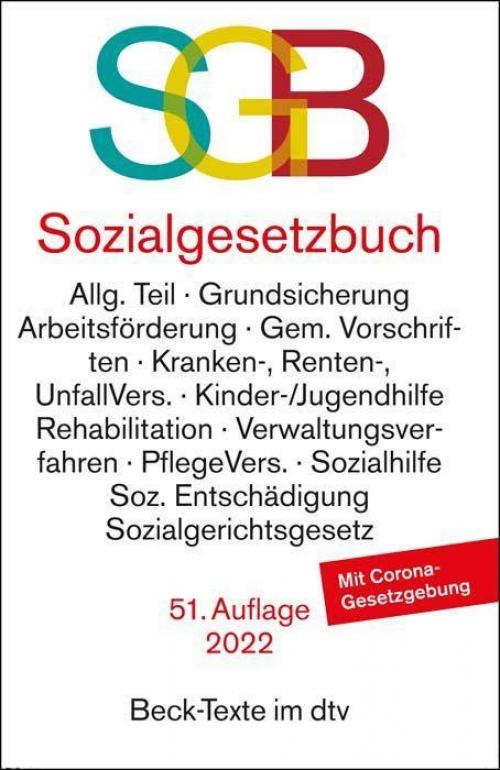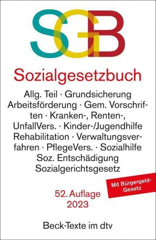 Sozialgesetzbuch (SGB) Erstes Buch (I) - Allgemeiner Teil, Sozialgesetzbuch (SGB) Zweites Buch (II) - Grundsicherung für Arbeitsuchende, Sozialgesetzbuch (SGB) Drittes Buch (III) - Arbeitsförderung, Viertes Buch Sozialgesetzbuch - Gemeinsame Vorschriften für die Sozialversicherung - (SGB IV), Sozialgesetzbuch (SGB) Fünftes Buch (V) - Gesetzliche Krankenversicherung, Sozialgesetzbuch (SGB) Sechstes Buch (VI) - Gesetzliche Rentenversicherung, Siebtes Buch Sozialgesetzbuch - Gesetzliche Unfallversicherung, Sozialgesetzbuch (SGB) Achtes Buch (VIII) - Kinder- und Jugendhilfe, Sozialgesetzbuch Neuntes Buch - Rehabilitation und Teilhabe von Menschen mit Behinderungen - (Neuntes Buch Sozialgesetzbuch - SGB IX), Zehntes Buch Sozialgesetzbuch - Sozialverwaltungsverfahren und Sozialdatenschutz - (SGB X), Sozialgesetzbuch (SGB) Elftes Buch (XI) Soziale Pflegeversicherung, Sozialgesetzbuch (SGB) Zwölftes Buch (XII) - Sozialhilfe, Sozialgesetzbuch Vierzehntes Buch - Soziale Entschädigung - (SGB XIV), Sozialgerichtsgesetz (SGG).